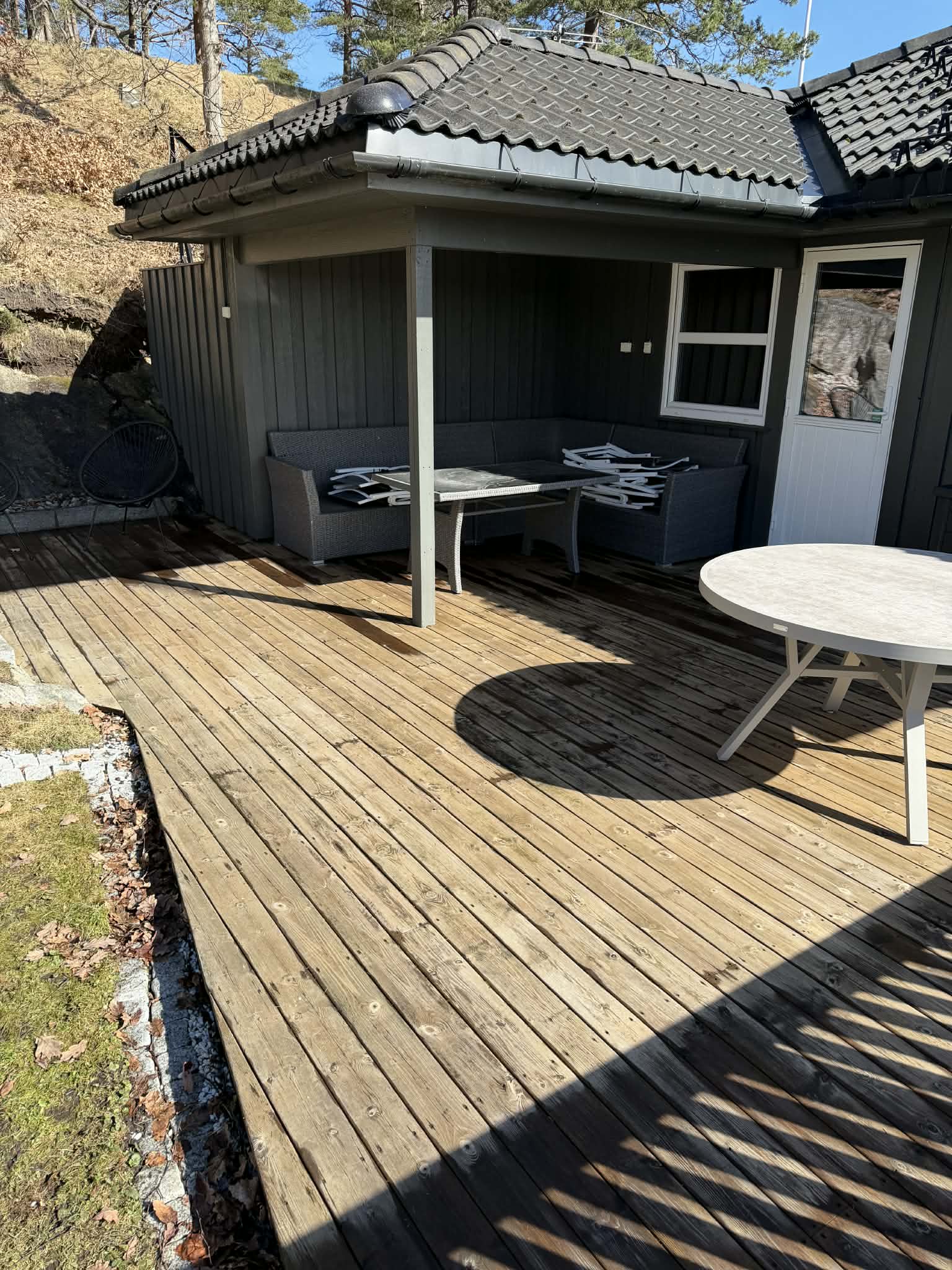 Treverket fremstår lysere og mer velholdt etter at skitt og belegg er fjernet.